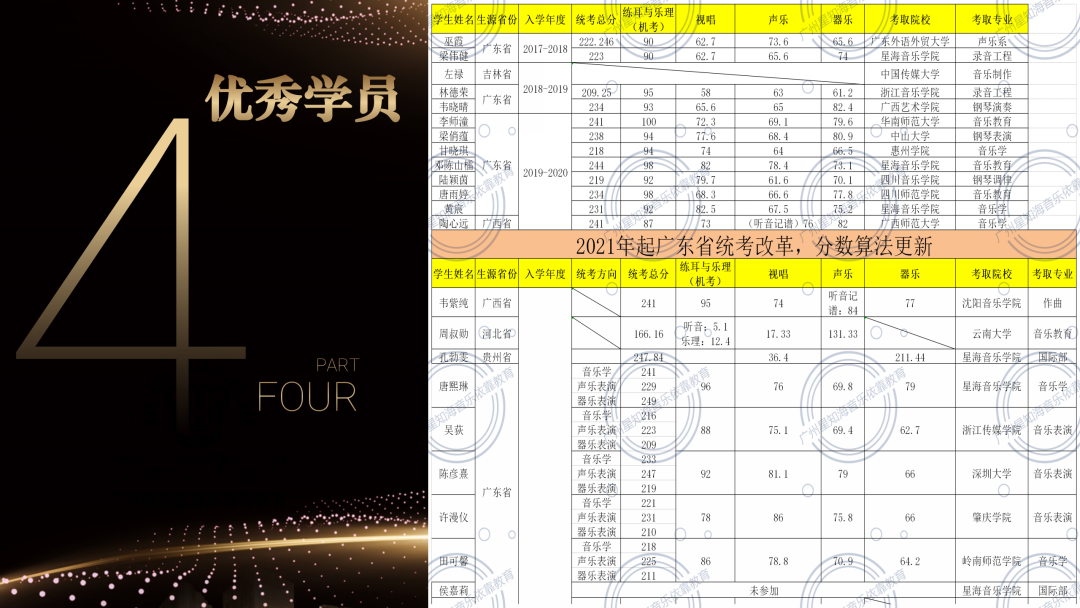 05 升学建议 学生生活状态、学习状态、心理状态每月将按照星知海独有的 五边形数据采集系统 整合后,每月定期发给家长。并根据考前定格状态给予个性化升学建议书。06 带考服务 统考期间,广东省内学员享受大学城带考服务,由老师带领踩点考场、租赁考场附近琴房。 校考期间,学员享受每人免费1套校考录制服务。