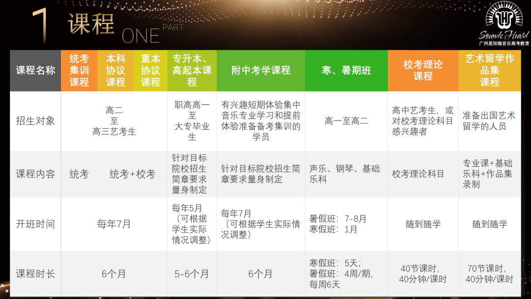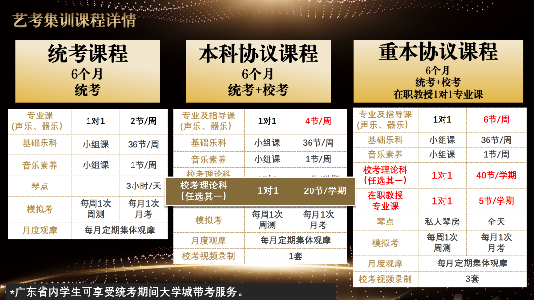 课程体系 01 入学专业评估 系统测试学生的基础乐科和专业课的入学,为学生量身定制集训课程。02 量身定制课程03 伴学试小班集训 根据学生个人特点因材施教,除1对1专业课外,另有1对1指导课加持,每阶段任务定制明确。老师与学生住同栋宿舍,与学生同吃同睡,24小时生活、学业关怀。