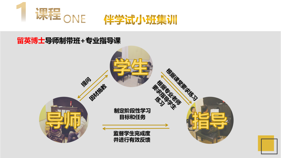 学员在入学前专业评估可得到个性化的课程规划;入学后由留英博士以伴读式系统教学法授课;考前冲刺辅导。整个教学过程中由导师带领的教师团队全方位引领学生保持在正确的轨道内备考。让学员体会到高质量、高强度、专业的教学和管理,让学生在专业领域、身心健康取得极大的发展,优质的教学环境,让学子们体验沉浸式艺考集训。