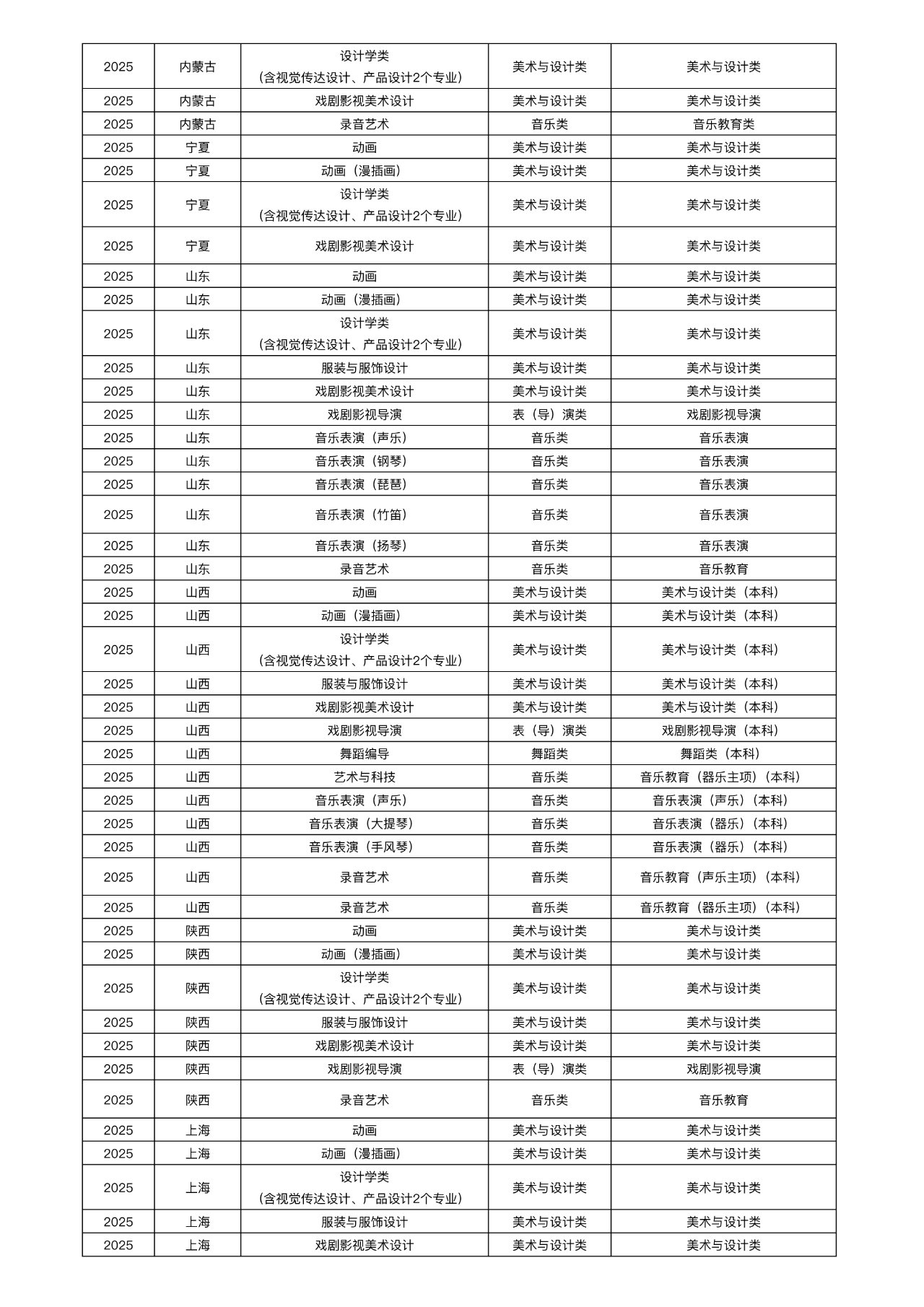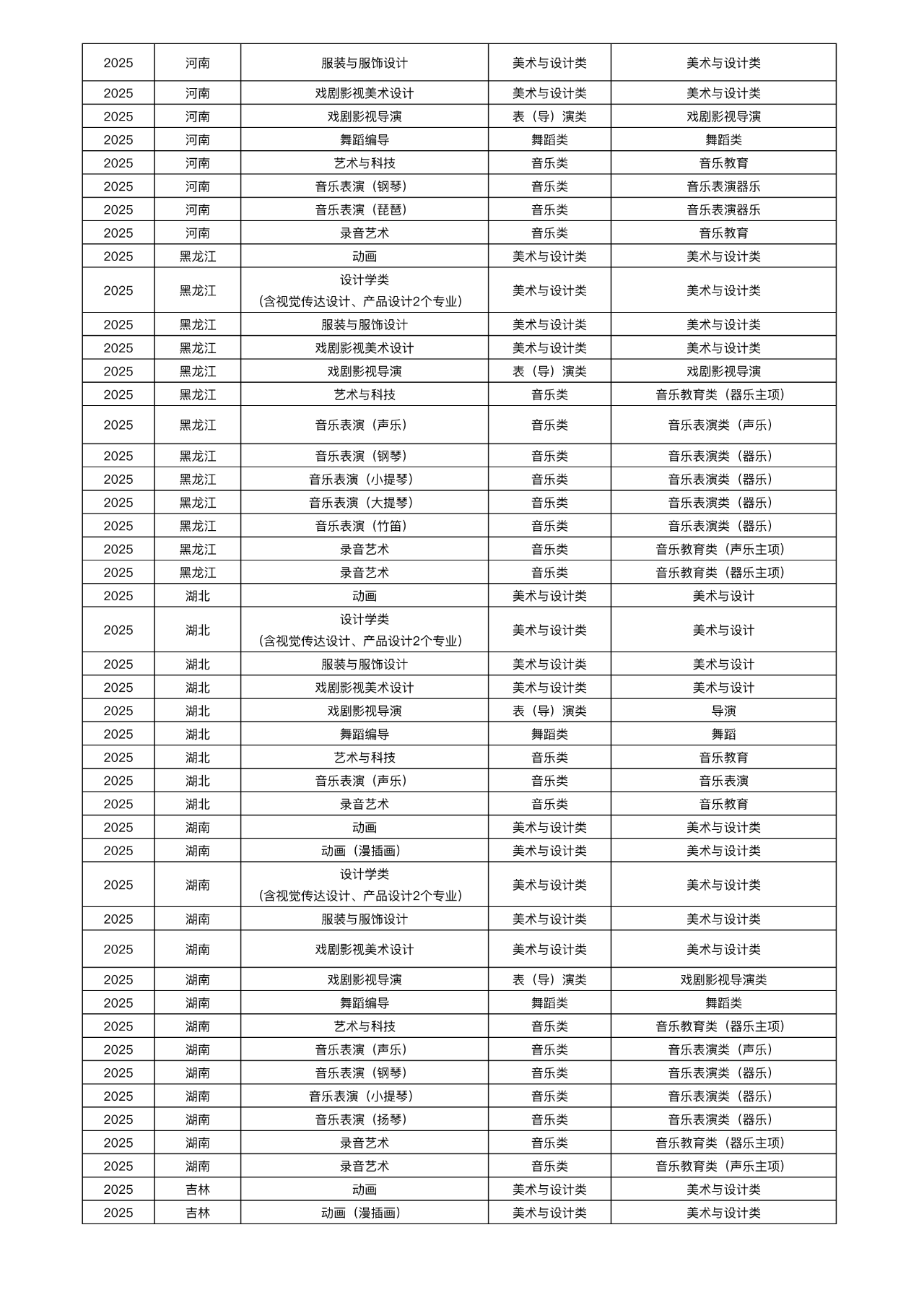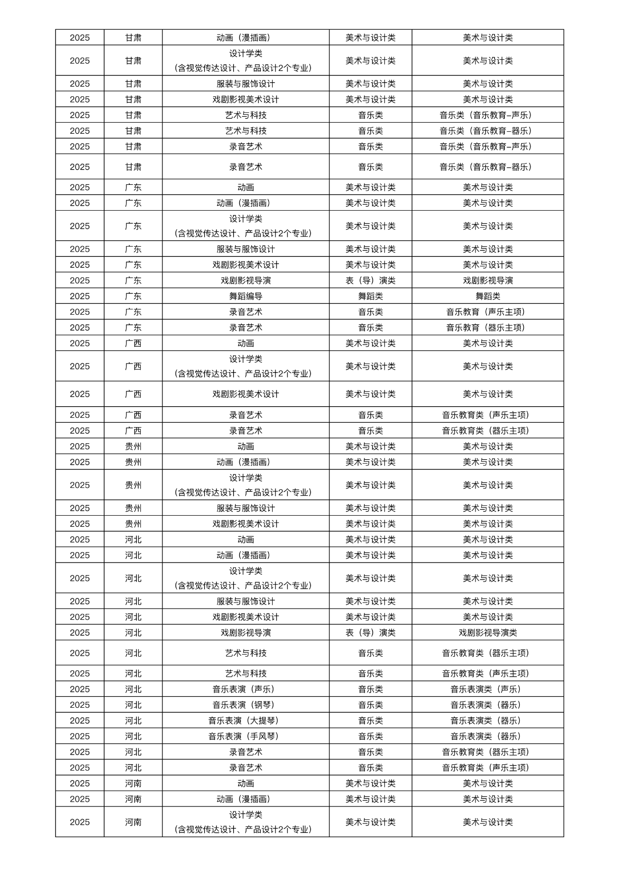 省级统考成绩招生艺术类专业与省级统考子科类对照关系表