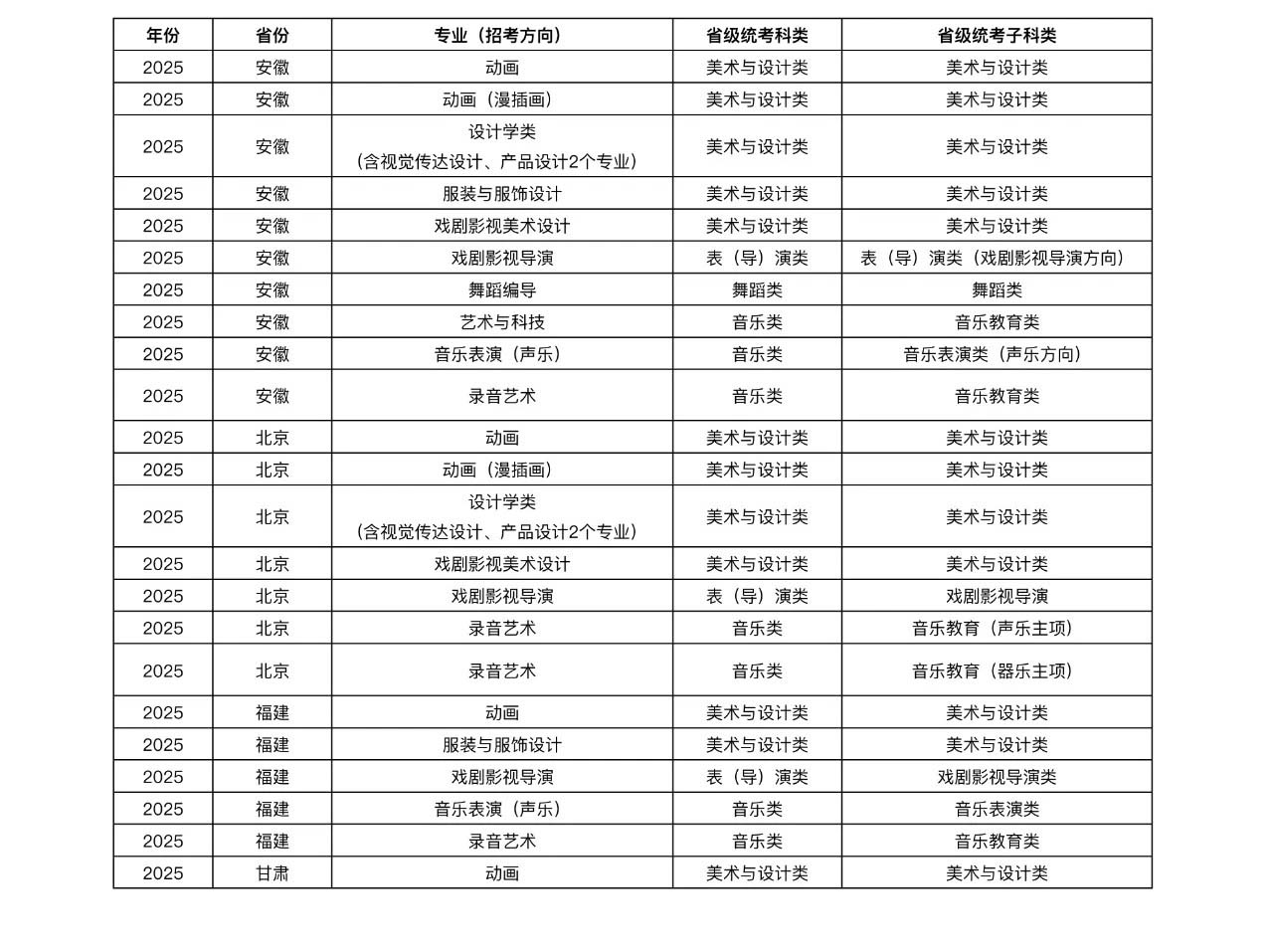 按照教育部相关文件规定,经各省级招生考试机构审核通过,现将我校2025年承认省级统考成绩招生艺术类专业与省级统考子科类对照关系公布如下。 说明:各省份招生计划,以教育部和各省级招生考试机构最终审定的计划为准。 以上内容来自浙江传媒学院招生办