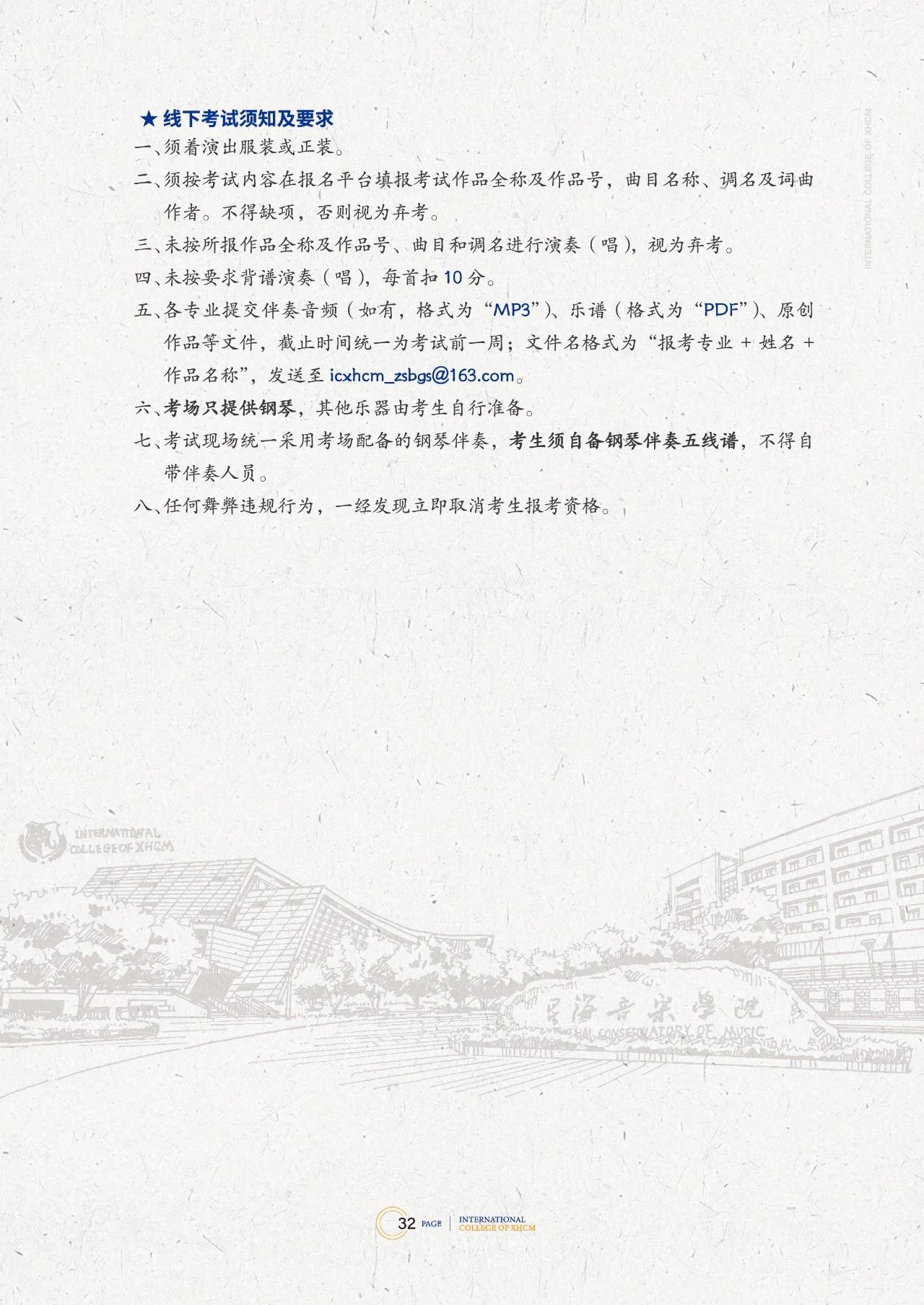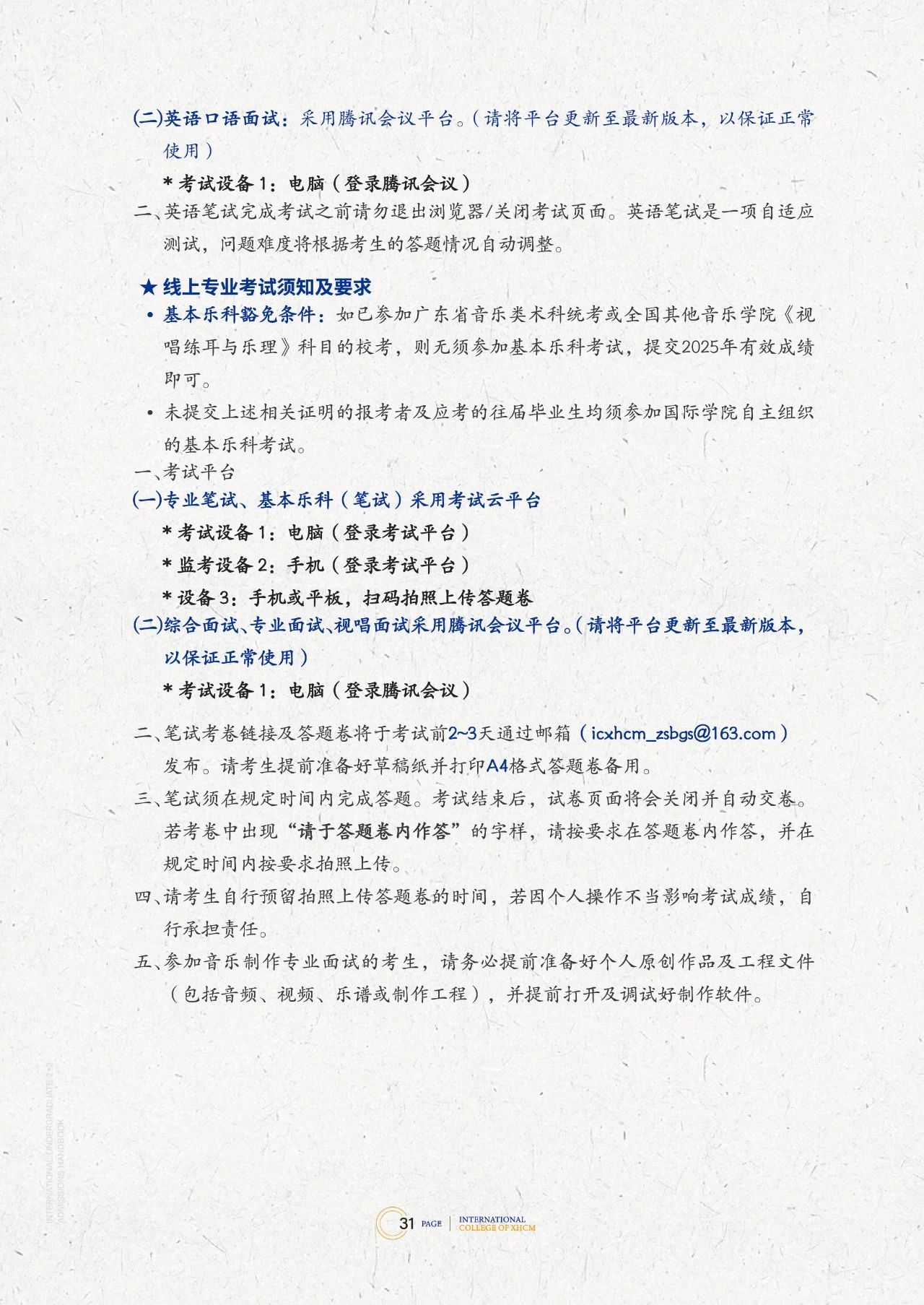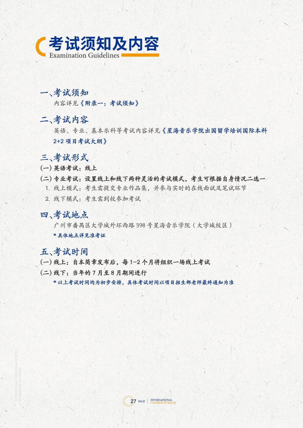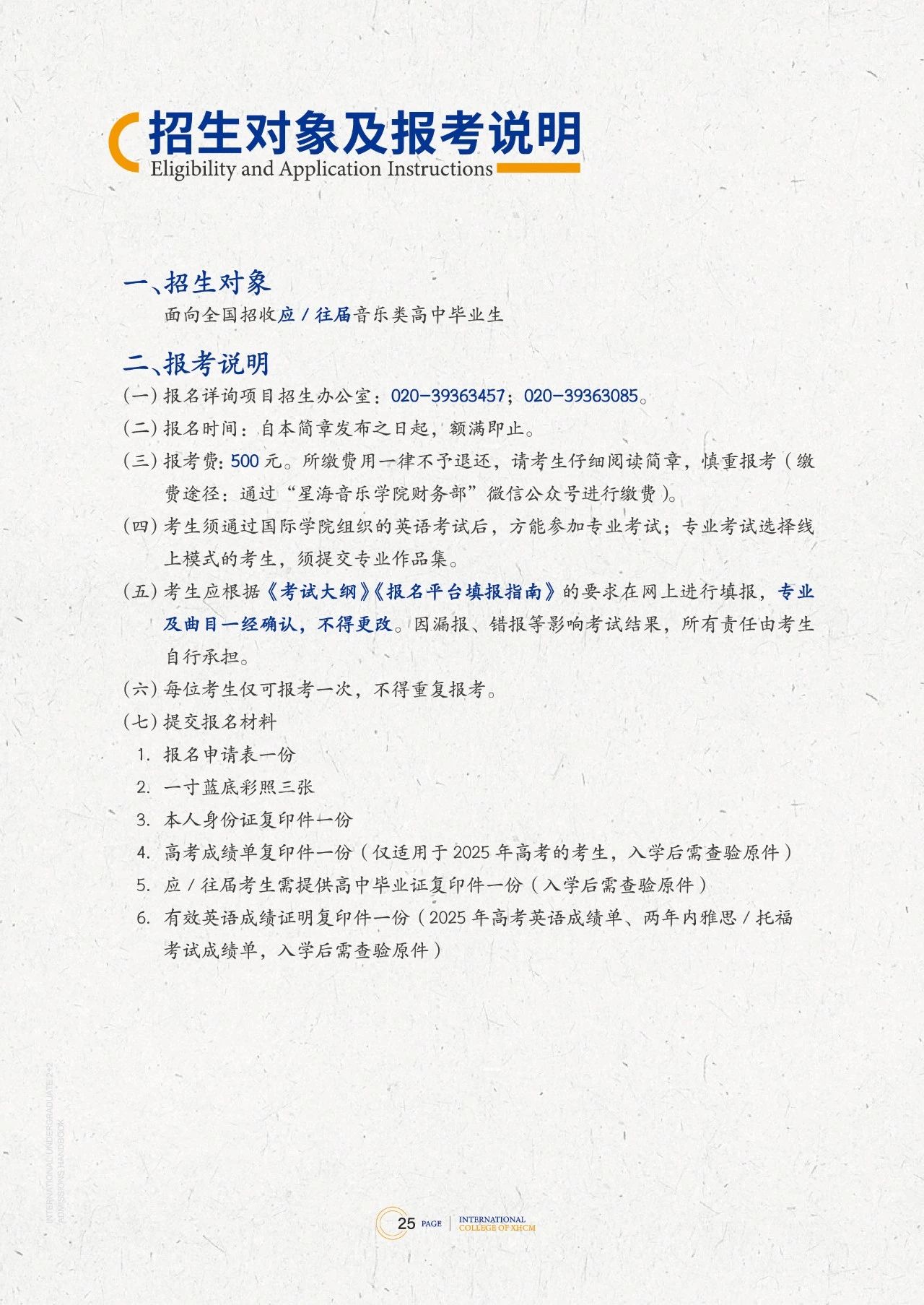 1. 2025年星海音乐学院国际本科项目将增加线上考试,考生无需到校,提交作品和线上参加笔试面试即可,大概每1-2个月(根据报考人数)会举办一场。 2. 招生专业:流行音乐20人、音乐教育30人、艺术管理30人、音乐制作20人。 3. 招生对象:应届、往届音乐类高中毕业生。