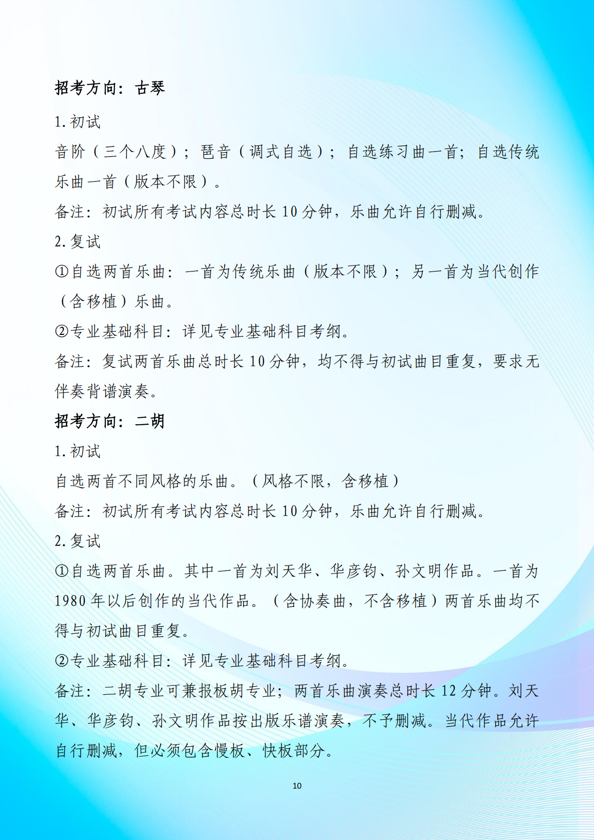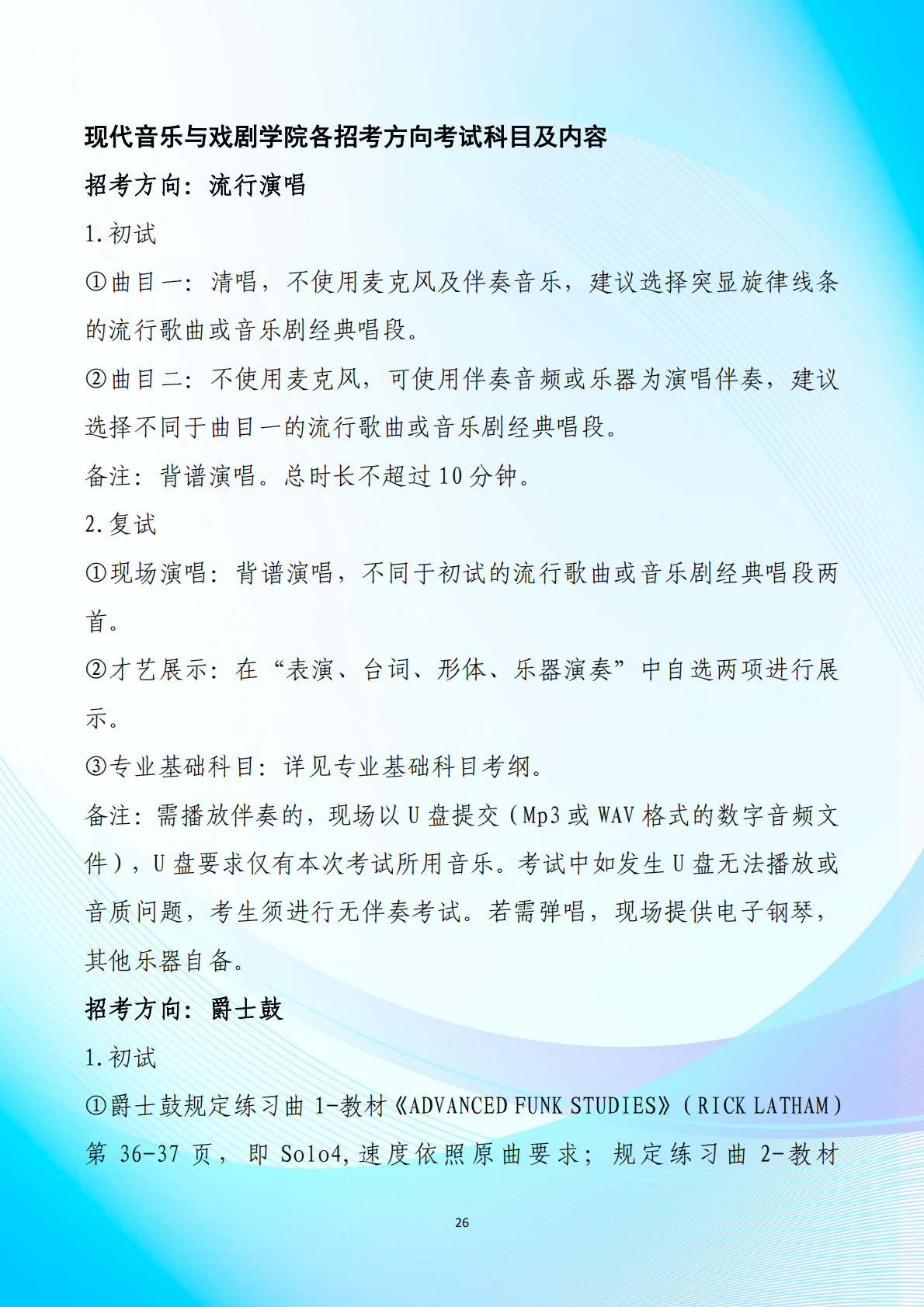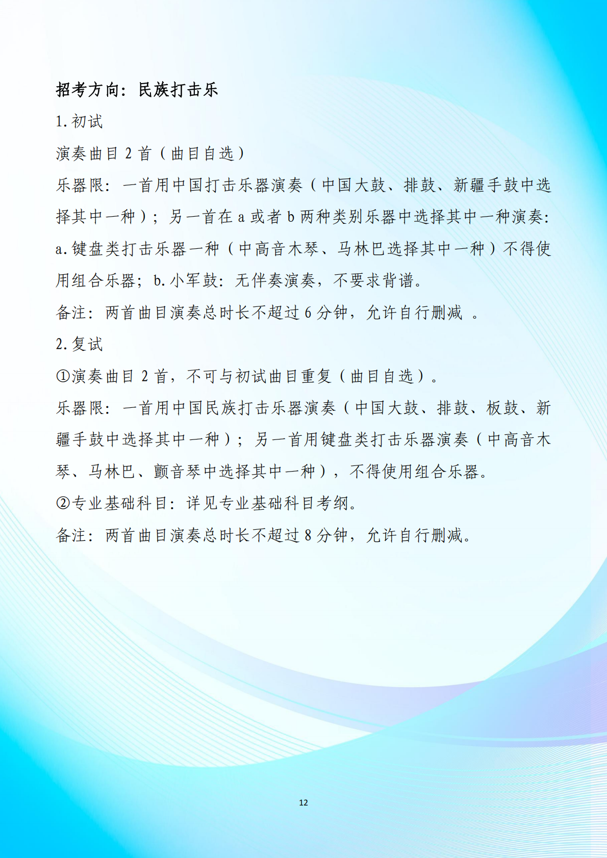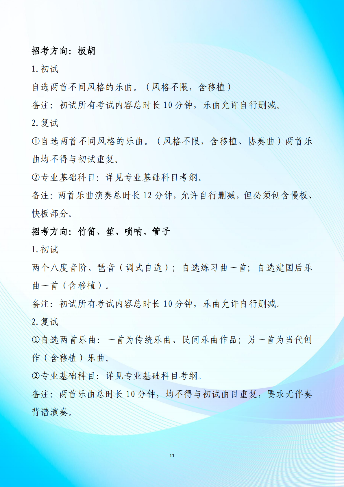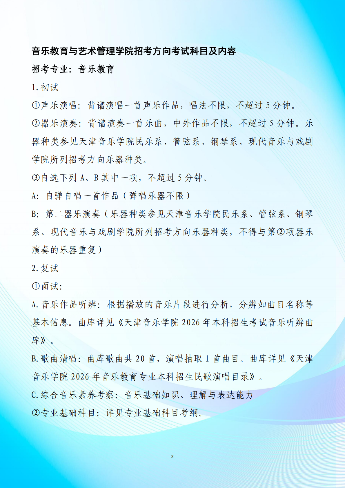 2026届的音乐学专业校考中,除了基础乐科仍保持在复试中考察以外,其他所有初试内容与25届复试内容对调。 26届不再区分钢琴主项及声乐主项,允许非钢琴的学生报考音乐教育专业,且初试需要选择加试任意乐器自弹自唱或者第二乐器演奏。复试增加歌曲清唱考项。 作曲取消电子音乐方向招生。 民乐演奏专业变动内容: 不再设规定曲目,考生可自选曲目。 部分乐器种类增加规定考试曲目。 具体考纲内容