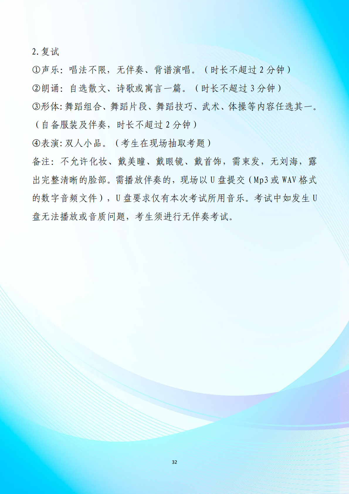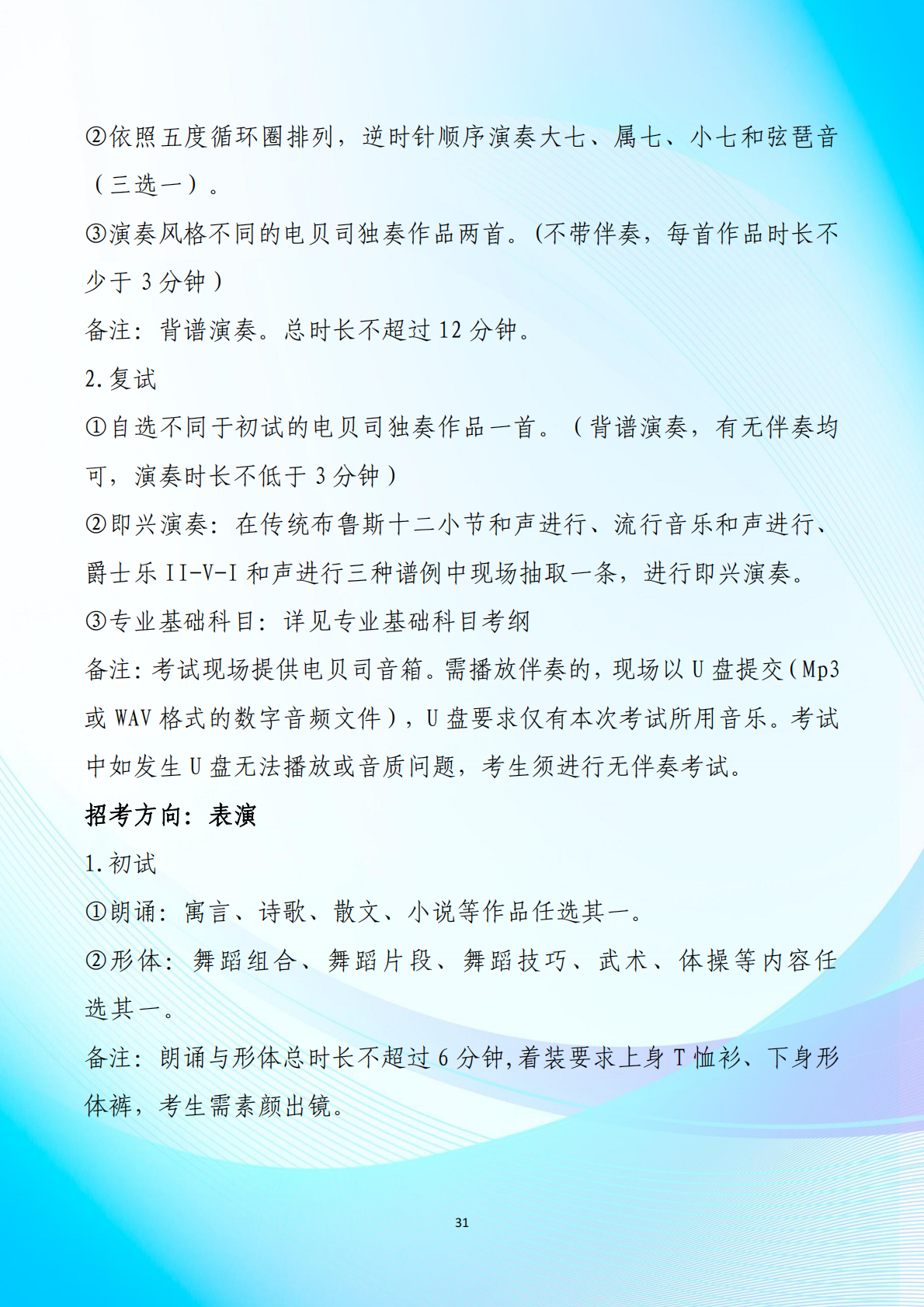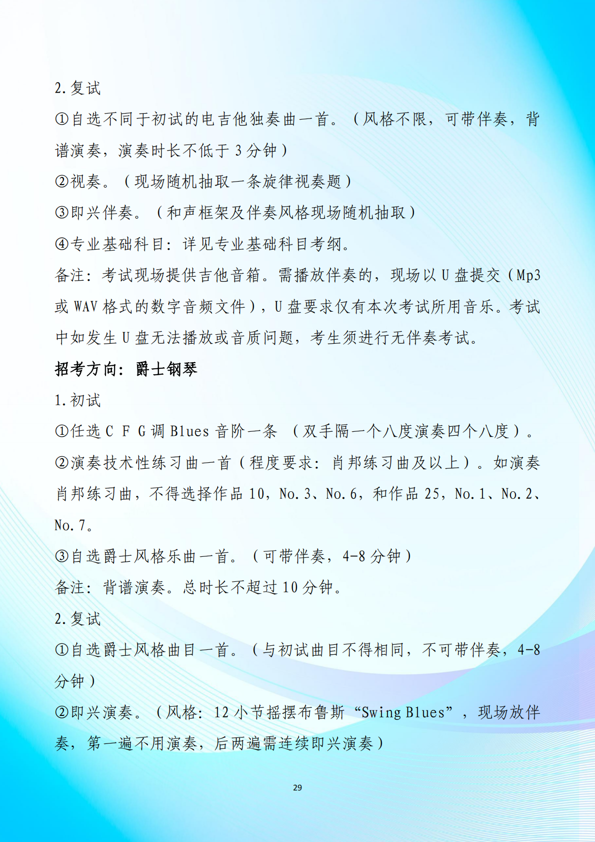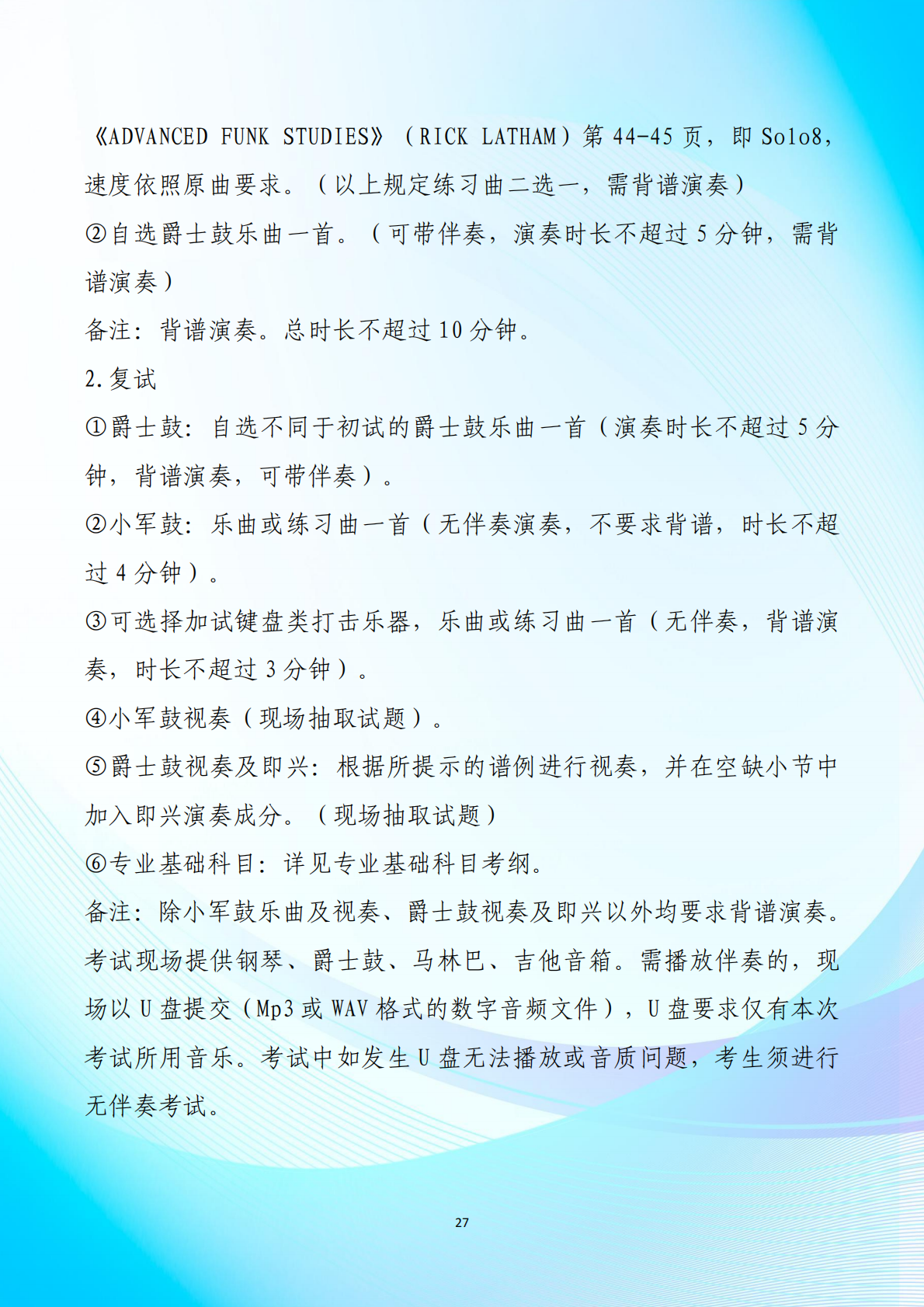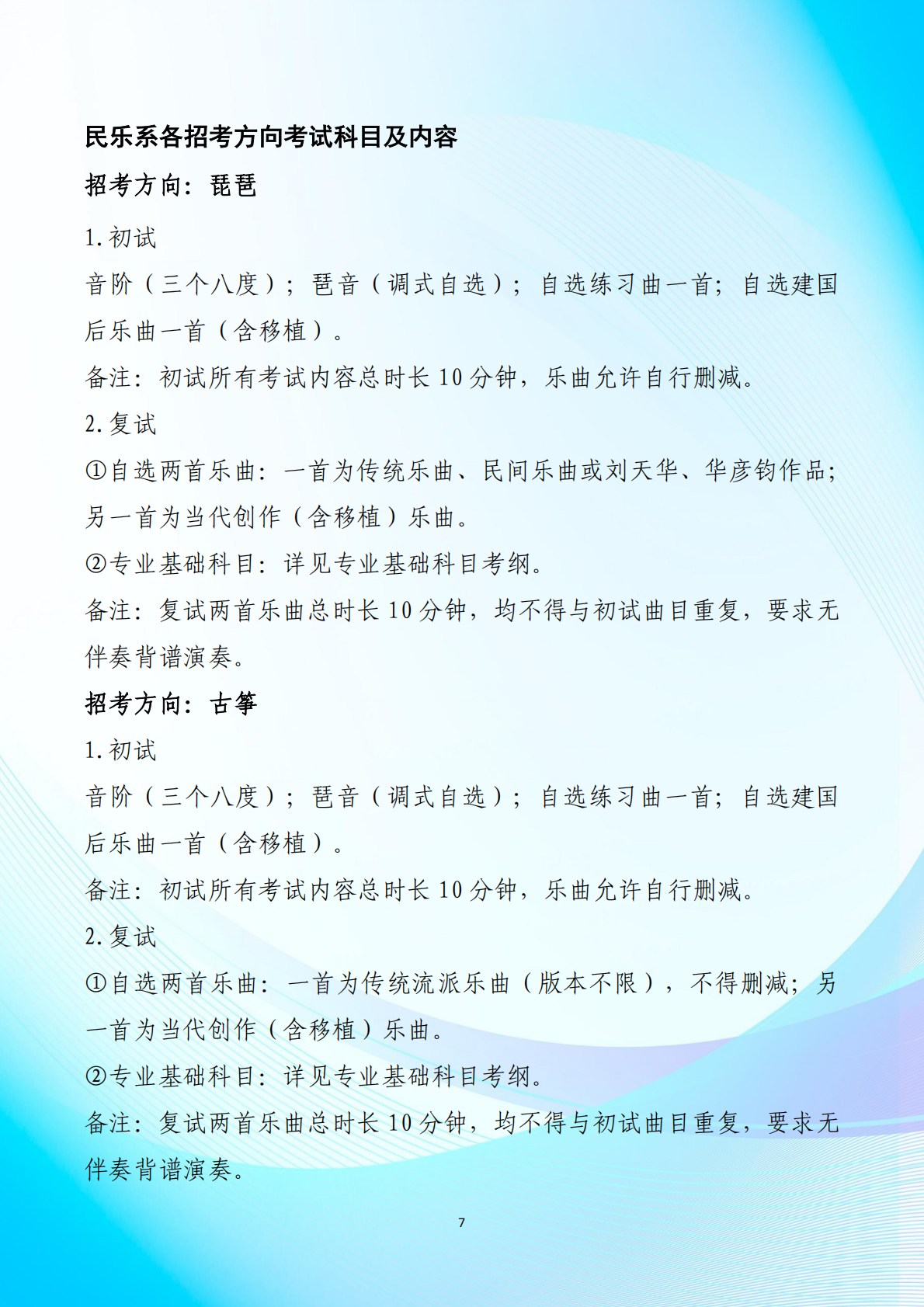 2026届的音乐学专业校考中,除了基础乐科仍保持在复试中考察以外,其他所有初试内容与25届复试内容对调。 26届不再区分钢琴主项及声乐主项,允许非钢琴的学生报考音乐教育专业,且初试需要选择加试任意乐器自弹自唱或者第二乐器演奏。复试增加歌曲清唱考项。 作曲取消电子音乐方向招生。 民乐演奏专业变动内容: 不再设规定曲目,考生可自选曲目。 部分乐器种类增加规定考试曲目。 具体考纲内容